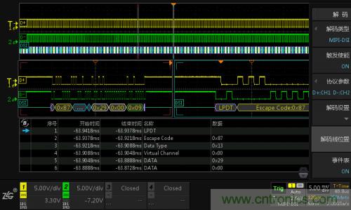 (1)現(xiàn)場模擬MIPI-DSI協(xié)議,使用數(shù)據(jù)挖掘型示波器ZDS4054 Plus,其免費標配MIPI-DSI協(xié)議低速LP模式解碼功能,具體操作如下圖7所示。
