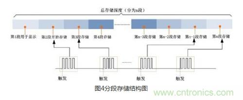 原理如下圖所示:總的存儲(chǔ)深度分為n段,第1段用于顯示,第2段開(kāi)始存儲(chǔ),也就是當(dāng)發(fā)生第一次觸發(fā)時(shí)采集的數(shù)據(jù)存儲(chǔ)到第2段存儲(chǔ)空間中,當(dāng)?shù)?段存儲(chǔ)空間存儲(chǔ)滿(mǎn)之后,結(jié)束第一次觸發(fā),等待第二次觸發(fā)的到來(lái),觸發(fā)后把數(shù)據(jù)存儲(chǔ)到第3段存儲(chǔ)空間中,以此類(lèi)推。
