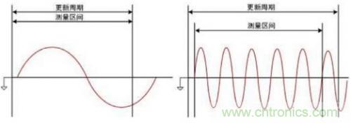 3.選擇合適的量程、更新率和同步源對功率分析儀的測量準確性至關(guān)重要。例如當更新周期小于被測信號周期時,如下圖4所示,整個更新周期內(nèi)的數(shù)據(jù)成為測量區(qū)間,整個更新周期內(nèi)的采樣數(shù)據(jù)將被平均,因此影響測量結(jié)果的準確性。在這種情況下需要增大更新周期,使得包含更多周期的被測信號進入測量區(qū)間;