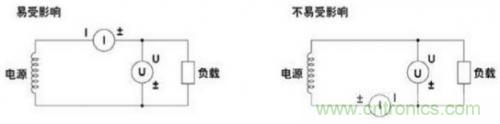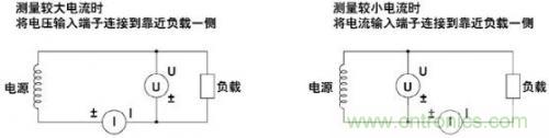 5.降低功率損耗的影響,在測量大電流情況下,需要將電壓測量回路接到靠近負載一側(cè),電流測量回路測得的結(jié)果就是流經(jīng)負載和電壓測量回路的電流之和,測量誤差僅是流經(jīng)電壓測量回路的電流。在測量小電流情況下,則需要將電流測量回路接到靠近負載一側(cè),電壓測量回路測得的結(jié)果就是負載電壓和電流測量回路的電壓之各,測量誤差僅是電流測量回路兩端電壓;如圖6所示。