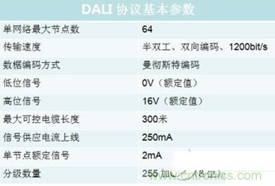 DALI數(shù)字式可尋址燈光接口(Digital Addressable LighTIng Interface)鎮(zhèn)流器是當前最新的可調光熒光燈鎮(zhèn)流器。DALI是一個數(shù)據(jù)傳輸?shù)膮f(xié)議,它定義了電子鎮(zhèn)流器與設備控制器之間的通信方式,基于DALI 協(xié)議組建的系統(tǒng)具有分布式智能模塊, 各個智能化DALI 模塊都具有數(shù)字控制和數(shù)字通信能力, 地址和燈光場景信息等都存儲于各個DALI 模塊的存儲器內(nèi)。DALI 模塊通過DALI 總線進行數(shù)字通信、傳遞指令和狀態(tài)信息,實現(xiàn)燈的開關、調光控制、系統(tǒng)的設置等功能。DALI總線制定一個系統(tǒng)結構簡單、安裝方便、操作容易、功能良優(yōu)的燈光控制系統(tǒng),可用于一個房間內(nèi)的燈光控制,還可以連接更高級的設備網(wǎng)絡,如以太網(wǎng),以支持更多的設備和足夠的網(wǎng)絡帶寬。 DALI協(xié)議的基本參數(shù)如下:
