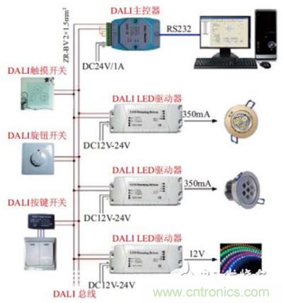 DALI總線主要用于多個熒光燈以及LED照明的調光控制。通過調光控制器可對每個鎮(zhèn)流器分別尋址,一個單段DALI數(shù)椐控制線上可以對64個鎮(zhèn)流器分別編址,每個鎮(zhèn)流器內(nèi)可以設置16個燈光場景,同一個鎮(zhèn)流器還可以編在一組或多個組,最大編組數(shù)為16,也就是一個DALI系統(tǒng)可控制多達1000個鎮(zhèn)流器。