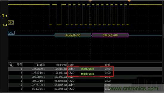 現(xiàn)場模擬照明控制DALI通信協(xié)議,這里用數(shù)據(jù)挖掘型示波器ZDS4054 Plus為例,其免費標配DALI協(xié)議解碼功能,可對全內(nèi)存512Mpts的數(shù)據(jù)進行解碼,且可對照明控制器與鎮(zhèn)流器之間的信號監(jiān)測,取其中一幀數(shù)據(jù)的信息在事件表中進行查看,如下圖6所示: