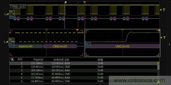 對長時間監(jiān)測的數(shù)據(jù)進行異常分析,可在示波器的縮放模式下使用雙ZOOM多窗口顯示的功能,對信號進行多窗口異常監(jiān)測和分析,可同時對任一數(shù)據(jù)幀和數(shù)椐幀上升沿或下降沿細節(jié)進行分析,然后通過查看放大數(shù)椐細節(jié),事件表中的數(shù)據(jù)和波形一一對應,定位異常非常方便,如下圖7所示。
