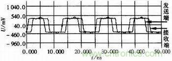 在實(shí)際的PCB布線時(shí),如果由于產(chǎn)品結(jié)構(gòu)的需要,不能縮短信號(hào)線長(zhǎng)度時(shí),應(yīng)采用差分信號(hào)傳輸。差分信號(hào)有很強(qiáng)的抗共模干擾能力,能大大延長(zhǎng)傳輸距離。差分信號(hào)有很多種,如ECL、PECL、LVDS等,表1列出LVDS相對(duì)于ECL、PECL系統(tǒng)的主要特點(diǎn)。LVDS的恒流源模式低擺幅輸出使得LVDS能高速驅(qū)動(dòng),對(duì)于點(diǎn)到的連接,傳輸速率可達(dá)800Mbps,同時(shí)LVDS低噪聲、低功耗,連接方便,實(shí)際中使用較多。LVDS的驅(qū)動(dòng)器由一個(gè)通常為3.5mA的恒流源驅(qū)動(dòng)對(duì)差分信號(hào)線組成。接收端有一個(gè)高的直流輸入阻抗,幾科全部的驅(qū)動(dòng)電流流經(jīng)10Ω的終端電阻,在接收器輸入端產(chǎn)生約350mV電壓。當(dāng)驅(qū)動(dòng)狀態(tài)反轉(zhuǎn)時(shí),流經(jīng)電阻的電流方向改變,此時(shí)在接收端產(chǎn)生有效的邏輯狀態(tài)。圖5是利用LVDS芯片DS90LV031、DS90LV032把信號(hào)轉(zhuǎn)換成差分信號(hào),進(jìn)行長(zhǎng)距離傳輸?shù)牟ㄐ螆D。在仿真時(shí)設(shè)置仿真頻率為66MHz理想方波,傳輸距離為508mm,差分對(duì)終端接100Ω負(fù)載匹配傳輸線的差分阻抗。從仿真結(jié)果看,LVDS接收端的波形除了有延遲外,波形保持完好。