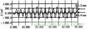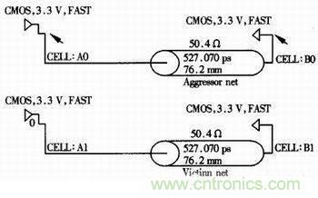 由于頻率的提高,傳輸線之間的串?dāng)_明顯增大,對(duì)信號(hào)完整性也有很大的影響,可以通過(guò)仿真來(lái)預(yù)測(cè)、模擬,并采取措施加以改善。以CMOS信號(hào)為例建立仿真模型,如圖6所示。在仿真時(shí)設(shè)置干擾信號(hào)的頻率為66MHz的方波,被干擾者設(shè)置為零電平輸入,通過(guò)調(diào)整兩根線的間距和兩線之間平行走線的長(zhǎng)度來(lái)觀察被干擾者接收端的波形。仿真結(jié)果如圖7,分別為間距是203.2mm、406。4mm時(shí)的波形。