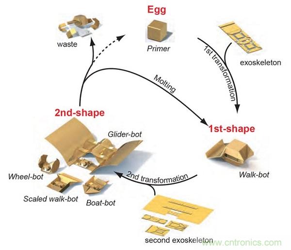MIT開發(fā)透過磁鐵遠(yuǎn)程控制的Primer機器人,其以長方形塑料片制造的外骨骼能自行折疊成不同的形狀,為各種不同的任務(wù)客制機器人;而當(dāng)Primer完成工作后,則浸入水中溶解外骨骼…