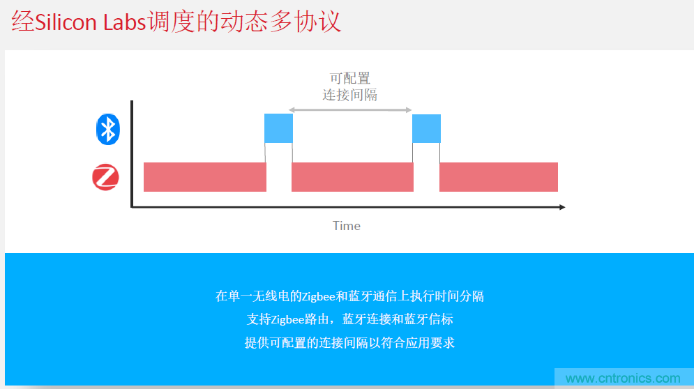 Silicon Labs在芯片設(shè)計時,就提出了動態(tài)多協(xié)議的做法。即:在單一無線電的Zigbee和藍牙通信上執(zhí)行時間分隔,支持Zigbee路由、藍牙連接和藍牙信標(biāo)。為工程師提供可配置的連接間隔,以符合應(yīng)用要求。陳雄基表示,目前這種做法據(jù)他所知Silicon Labs是業(yè)界唯一已經(jīng)在技術(shù)上實現(xiàn)的公司。