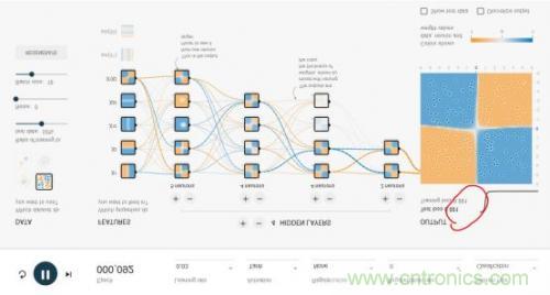 整個網(wǎng)絡的輸入層是FEATURES(待解決問題的特征),例如x1和x2表示垂直或者水平切分來劃分藍色與黃色點,這是最容易理解的2種劃分點的方法。其余5種其實不太容易想到,這也是傳統(tǒng)的專家系統(tǒng)才需要的,實際上,這個游樂場就是為了演示,1、好的神經(jīng)網(wǎng)絡只用最基本的x1,x2這樣的輸入層FEATURES就可以完美的實現(xiàn);2、即使有很多種輸入特征,我們其實并不清楚誰的權(quán)重最高,但好的神經(jīng)網(wǎng)絡會解決掉這個問題。