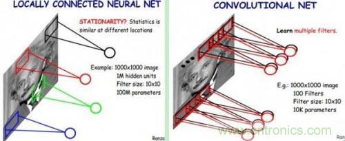 CNN中認為同一層中的權(quán)重參數(shù)可以共享,因為同一張圖片的各個不同區(qū)域具有一定的相似性。這樣原本的全連接計算量過大問題就解決了,如下圖所示: