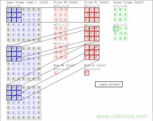 這里卷積核大小與移動的步長stride、輸出深度決定了下一層網(wǎng)絡的大小。同時,核大小與stride步長在導致上一層矩陣不夠大時,需要用padding來補0(如上圖灰色的0)。以上就叫做卷積運算,這樣的一層神經(jīng)元稱為卷積層。上圖中W0和W1表示深度為2。
