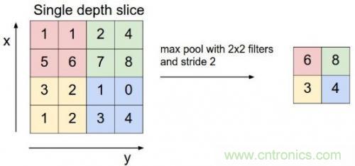 CNN中還有一個池化層,當某一層輸出的數(shù)據(jù)量過大時,通過池化層可以對數(shù)據(jù)降維,在保持住特征的情況下減少數(shù)據(jù)量,例如下面的4*4矩陣通過取最大值降維到2*2矩陣: