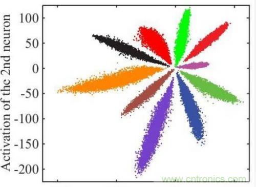 以上只是通用的CNN網(wǎng)絡,由于人臉識別應用中不是直接分類,而是有一個注冊階段,需要把照片的特征值取出來。如果直接拿softmax分類前的數(shù)據(jù)作為特征值效果很不好,例如下圖是直接將全連接層的輸出轉(zhuǎn)化為二維向量,在二維平面上通過顏色表示分類的可視化表示: