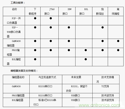 編程器型號有GANG430(RS232串行接口,串口、1拖8,支持JTAG、SBW,不支持BSL),PRGS430-IIIA多功能編程器(支持JTAG、SBW、BSL),這些編程器都可以做離線燒寫,并且支持燒寫熔絲,即脫離計算機(jī)來對目標(biāo)板燒寫,其中PRGS編程器還支持序列號燒寫方式。另還有專門的BSL編程器,只支持BSL接口,不支持燒寫熔絲。