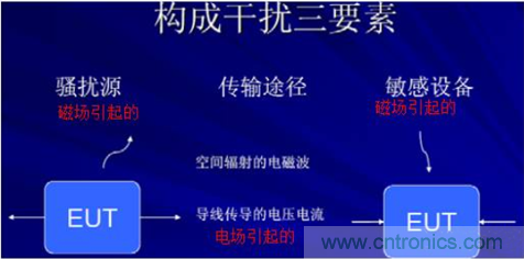 那么,構(gòu)成干擾要有三要素,騷擾源,傳播途徑,敏感設(shè)備。騷擾源分兩種,一種是電場的騷擾源,一種是磁場的騷擾源。