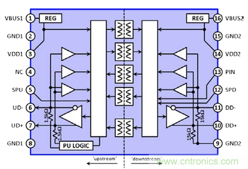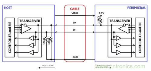 2. 它必須管理USB電纜上的雙向通信,確保其收發(fā)器在適當(dāng)?shù)臅r(shí)候進(jìn)行發(fā)送和接收,并精確重現(xiàn)所有驅(qū)動(dòng)和空閑狀態(tài)。若要精確重現(xiàn)空閑狀態(tài),它必須在其上游側(cè)配置上拉電阻,以模擬連接下游外設(shè)的上拉電阻狀態(tài)。它在下游側(cè)也需配置下拉電阻。必須監(jiān)控總線上表示總線空閑、分組開始和分組結(jié)束的信號,以便正確響應(yīng)這些狀況。