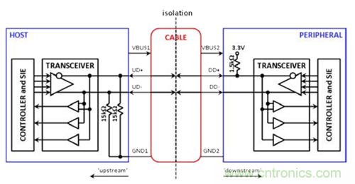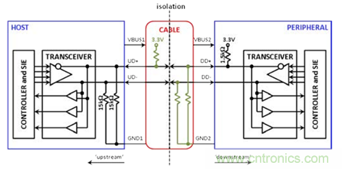 一種可能的隔離方法如圖2a所示。圖中,虛線表示隔離在理論上將USB電纜分割。D+和D–的狀態(tài)信息可以跨越隔離柵,但電流不能。GND1節(jié)點(diǎn)(上游的接地基準(zhǔn))現(xiàn)在與GND2節(jié)點(diǎn)(下游的接地基準(zhǔn))相互分離。不幸的是,隔離使主機(jī)無法“看到”下游的上拉電阻,而外設(shè)無法“看到”上游的下拉電阻。因此,需要使用一些額外的電阻,如圖2b所示,以便跨越隔離模仿相應(yīng)連接。在這個(gè)“透明”概念中,主機(jī)與外設(shè)之間的通信方式和圖1中的非隔離式連接十分類似。透明的USB