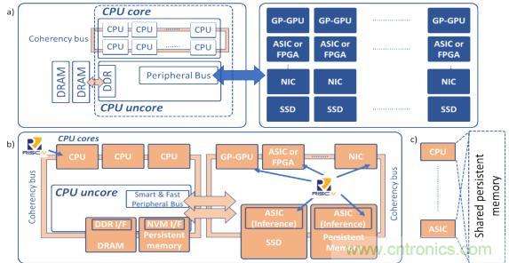 在圖2a中,傳統(tǒng)的計(jì)算體系結(jié)構(gòu)由于把一條慢速外設(shè)總線用于快速存儲(chǔ)器及計(jì)算加速設(shè)備,其能力已達(dá)到其極限。在圖2b中,未來(lái)的計(jì)算體系結(jié)構(gòu)采用了開放接口,能夠?yàn)槠脚_(tái)上所有的計(jì)算資源提供統(tǒng)一并支持高速緩存一致性的訪問(wèn)方式來(lái)訪問(wèn)共享持久內(nèi)存,(這稱為以數(shù)據(jù)為中心的體系結(jié)構(gòu))。在圖2c中,所部署的設(shè)備能夠使用相同的共享內(nèi)存,從而減少了不必要的數(shù)據(jù)復(fù)制。