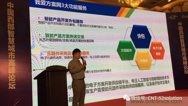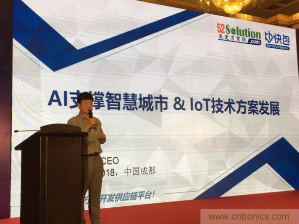 為服務西部產業(yè)創(chuàng)新,中電網絡技術/我愛方案網攜手四川本地技術服務商與中國電子信息博覽會來到成都,我愛方案網的CEO劉杰博士在2018中國智慧城市高峰論壇做大會報告,圍繞“AI支撐智慧城市和IoT技術方案發(fā)展”做了主題講演,分別介紹了AI發(fā)展路徑;通過大數據分析AI應用市場需求市場;解讀了AI處理器推動邊緣計算;列舉了大量AI物聯(lián)網方案開發(fā)案例,引起論壇參會人員的深度思考。