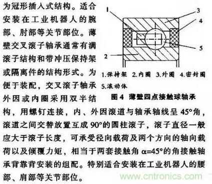 球軸承是機(jī)器人和機(jī)械手機(jī)構(gòu)中最常用的軸承。它能承受徑向和軸向載荷,摩擦較小。其機(jī)器人專用軸承四點(diǎn)接觸式設(shè)計(jì)以及高精度加工。這種軸承比同等軸徑的常規(guī)中系列四點(diǎn)接觸軸承輕25倍。它的內(nèi)圈(或外圈)由兩個半圈精確拼配而成,而其整體外圍(或內(nèi)圈) 的溝曲率半徑較小,使鋼球與內(nèi)、外圈在四個“點(diǎn)”上接觸。既加大了徑向負(fù)荷能力,又能以緊湊的尺寸承受很的兩個方向的軸向負(fù)荷,并且有很好的兩個方向的軸向限位能力,因?yàn)樗妮S向游隙相對較小。而其接觸角 (一般取為35)又較大。工業(yè)機(jī)器人專用薄壁四點(diǎn)接觸球軸承通常有帶密封圈和不帶密封圈的結(jié)構(gòu)形式(見圖4)。其主要由內(nèi)圈、外 圍、保持架、鋼球或非接觸式密封圈組成。內(nèi)、外圈均為整體結(jié)構(gòu)。鋼球與內(nèi)、外因溝道呈四點(diǎn)接觸.保持架為冠形插入式結(jié)構(gòu)。