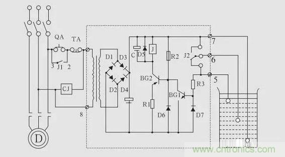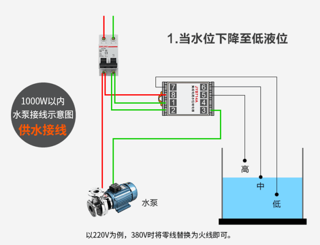 我們以這兩個電路為例,220伏電路和380伏電路接法是一樣的。一個是單相電機(jī)一個是三相電機(jī),所以液位繼電器的線圈電壓一個是220伏一個是380伏。如圖所示1和8是液位繼電器的線圈,5、6、7是液位繼電器的高中低3個液位探頭,2和3是一組常開點(diǎn),4和3是一組常閉點(diǎn)。