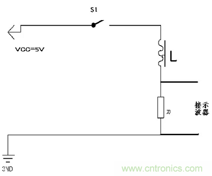舉例:一感值33uH的電感,測試電壓為5V,采樣電阻為0.5ohm。將示波器的調(diào)試合適觸發(fā)位置,關(guān)閉S,得到下面圖形。