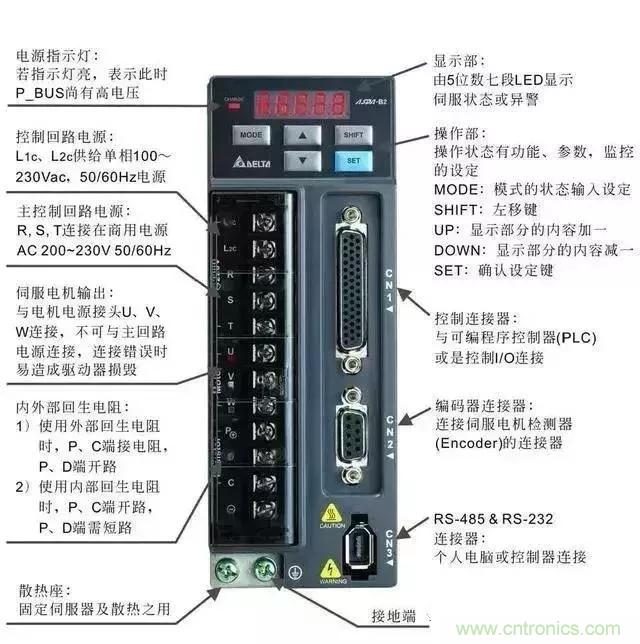 伺服驅(qū)動(dòng)器主要有控制回路電源、主控制回路電源、伺服輸出電源、控制器輸入CN1、編碼器接口CN2、連接起CN3。控制回路電源是單相AC電源,輸入電源可單相、三相,但是必須是220v,就是說三相輸入時(shí),咱們的三相電源必須經(jīng)過變壓器變壓才能接,對(duì)于功率較小的驅(qū)動(dòng)器,可單相直接驅(qū)動(dòng),單相接法必須接R、S端子。伺服電機(jī)輸出U、V、W切記千萬不能與主電路電源連接,有可能燒毀驅(qū)動(dòng)器。CN1端口主要用于上位機(jī)控制器的連接,提供輸入、輸出、編碼器ABZ三相輸出、各種監(jiān)控信號(hào)的模擬量輸出。
