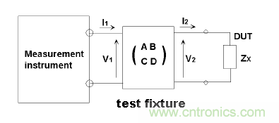 射頻電感電感量測量的原理圖如上,對(duì)于測試夾具的殘留因素和離散因素對(duì)測量系統(tǒng)的影響,行業(yè)的通用做法是用下面所示的F參數(shù)來描述: