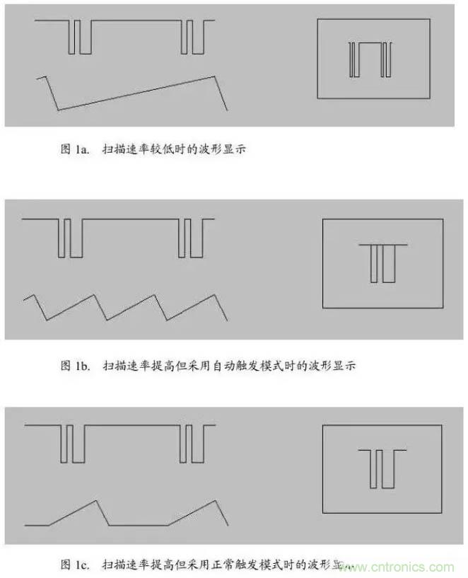 圖1 是這種情況的圖解,在圖1 中,左側(cè)上方是被觀測的波形,下方是掃描波形,右側(cè)是波形的顯示。圖1a中掃描速率較低,不便于觀察波形的細節(jié);圖1b將掃描速率提高,采用自動觸發(fā)模式,這時顯示的波形是不清晰的,有混疊現(xiàn)象;圖1c中的掃描速率與圖1b相同,但采用正常觸發(fā)方式,僅在有觸發(fā)時才進行掃描,因而顯示清晰的波形。