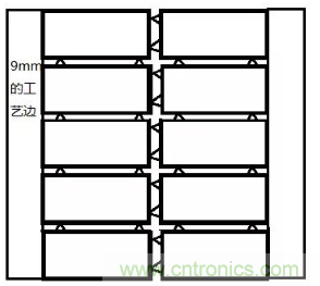 工藝邊用于在自動化貼片時,貼片機(jī)需要夾住板子的邊緣進(jìn)行貼片,通常只需要加兩邊即可。工藝邊寬度的選擇通常比較寬泛,可以選常用的9mm。注意工藝邊只是在貼片生產(chǎn)時用到,在元件組裝完后就可以掰掉的。開發(fā)人員在畫板子的時候不需要把工藝邊給畫上去,但是需要在發(fā)給廠家的文件中需要注明。工藝邊如下圖所示: