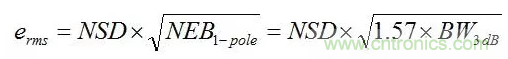 然而,關(guān)于應(yīng)把該乘法因數(shù)放在噪聲公式中的何處,似乎一直存在混淆。請(qǐng)記住,NEB調(diào)節(jié)的是帶寬,而非噪聲,因此應(yīng)在根號(hào)下面,如下式所示: