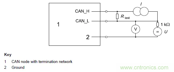 一個(gè)CAN節(jié)點(diǎn)集成電路協(xié)議設(shè)置為總線空閑時(shí),可檢測到的隱性位輸入限值應(yīng)通過圖 1的電路測量。其中I的值是指可以產(chǎn)生使節(jié)點(diǎn)在隱性狀態(tài)下檢測到隱性位的最大差分輸入電壓的電流值。電壓源U的電壓為: