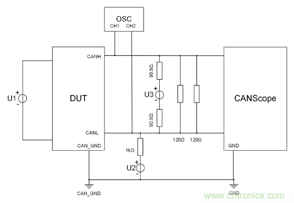 斷開電壓源U3,調(diào)節(jié)電壓源U2,逐步將共模電壓調(diào)到6.5V或-2V,在此期間DUT應(yīng)能正常發(fā)送報(bào)文;
