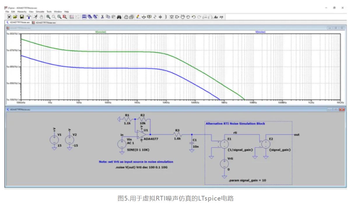 LTspice的多功能性和準(zhǔn)確性使其對(duì)噪聲仿真非常有用。輸出節(jié)點(diǎn)和輸入源在噪聲仿真命令中指定,輸出噪聲(RTO)是查看分析結(jié)果的默認(rèn)方式。LTspice還會(huì)根據(jù)RTI的傳統(tǒng)定義計(jì)算參考到指定輸入源的輸入噪聲,但如圖4所示,對(duì)傳統(tǒng)RTI噪聲進(jìn)行積分無法提供有意義的結(jié)果。圖5顯示了如何在LTspice的輸出中添加一級(jí),以便仿真器返回替代的虛擬RTI噪聲。運(yùn)行仿真后,在選定圖形的情況下,從Plot Settings—Add Trace將輸入噪聲添加到圖形中,然后選擇V(inoise)。這會(huì)將輸入噪聲添加到圖形中。曲線形狀與輸出噪聲相匹配,表明整個(gè)電路的頻率響應(yīng)都得到了考慮。在按住ctrl鍵的同時(shí)左鍵單擊圖形中標(biāo)題為"V(inoise)"的曲線,以對(duì)總RTI噪聲進(jìn)行積分。