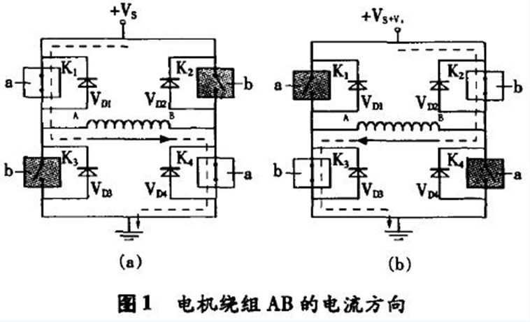 4個(gè)開(kāi)關(guān)K1和K4,K2和K3分別受控制信號(hào)a,b的控制,當(dāng)控制信號(hào)使開(kāi)關(guān)K1,K4合上,K2,K3斷開(kāi)時(shí),電流在線圈中的流向如圖1(a),當(dāng)控制信號(hào)使開(kāi)關(guān)K2,K3合上,K1,K4斷開(kāi)時(shí),電流在線圈中的流向如圖1(b)所示。4個(gè)二極管VD1,VD2,VD3,VD4為續(xù)流二極管,它們所起的作用是:以圖1(a)為例,當(dāng)K1,K4開(kāi)關(guān)受控制由閉合轉(zhuǎn)向斷開(kāi)時(shí),由于此時(shí)線圈繞組AB上的電流不能突變,仍需按原電流方向流動(dòng)(即A→B),此時(shí)由VD3,VD2來(lái)提供回路。因此,電流在K1,K4關(guān)斷的瞬間由地→VD3→線圈繞組AB→VD2→電源+Vs形成續(xù)流回路。同理,在圖1(b)中,當(dāng)開(kāi)關(guān)K2,K3關(guān)斷的瞬間,由二極管VD4,VD1提供線圈繞組的續(xù)流,電流回路為地→VD4→線圈繞組BA→VD1→電源+Vs。步進(jìn)電機(jī)驅(qū)動(dòng)器中,實(shí)現(xiàn)上述開(kāi)關(guān)功能的