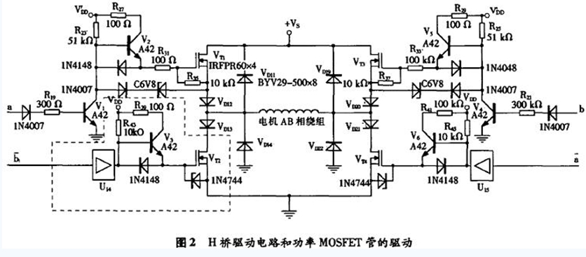 功率MOSFET管有內(nèi)接的快恢復(fù)二極管。當(dāng)不接VD11,VD12,VD13,VD14時(shí),假定此時(shí)電機(jī)AB相繞組由VT1管(和VT4管)驅(qū)動(dòng),即VT2管(和VB)截止,VT1管(和VT4管)導(dǎo)通,電流經(jīng)VT1管流過(guò)繞組。當(dāng)下一個(gè)控制信號(hào)使VT1管關(guān)斷時(shí),負(fù)載繞組的續(xù)流電流經(jīng)VT2的內(nèi)接快恢復(fù)二極管從地獲取。此時(shí),VT2管的漏源電壓即是該快恢復(fù)二極管的通態(tài)壓降,為一很小的負(fù)值。當(dāng)VT1再次導(dǎo)通時(shí),該快恢復(fù)二極管關(guān)斷,VT2的漏源電壓迅速上升,直至接近于正電源的電壓+VS,這意味著VT2漏源間要承受很高且邊沿很陡的上升電壓,該上升電壓反向加在VT2管內(nèi)的快恢復(fù)二極管兩端,會(huì)使快恢復(fù)二極管出現(xiàn)恢復(fù)效應(yīng),即有一個(gè)很大的電流流過(guò)加有反向電壓的快恢復(fù)二極管。為了抑制VT2管內(nèi)的快恢復(fù)二極管出現(xiàn)這種反向恢復(fù)效應(yīng),在圖2電路中接人了VD11,VD12,VD13,VD14。其中,反并聯(lián)快恢復(fù)二極管VD11,VD14的作用是為電機(jī)AB相繞組提供續(xù)流通路,VD12,VD13是為了使功率MOSFET管VT1,VT2內(nèi)部的快恢復(fù)二極管不流過(guò)反向電流,以保證VT1,VT2在動(dòng)態(tài)工作時(shí)能起正常的開(kāi)關(guān)作用。VD19,VD20,VD21,VD22的作用亦是同樣的道理。