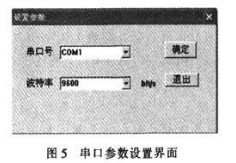 要實現(xiàn)計算機串行通信的功能,一種較為簡便的方法是使用MSComm(Microsoft Communication Control)通信控件,它提供了標準的事件處理函數(shù)過程,是微軟公司開發(fā)的專門用于串行通信的控件。它是高級語言編寫的串行通信程序和PC串口之間的橋粱。本系統(tǒng)采用得就是這種方法。設(shè)置控件的屬性。添加控件的響應(yīng)代碼。就可以使串口按照要求進行工作。在這個界面,可以進行串口號和波特率的設(shè)置。通信參效設(shè)置界面如圖5所示。