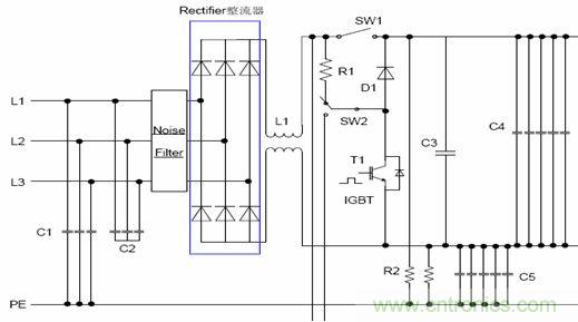電源系統(tǒng)是指將輸入系統(tǒng)的動力電源轉(zhuǎn)換成用于驅(qū)動交流電機(jī)的直流或交流電源,根據(jù)實(shí)際控制方式的不同,一般可以分為“交直交”電壓源型逆變電路,“交直交”電流源型逆變電路,“交交”型變頻電路以及泵電源電路等。圖1是“交直交”電壓源型電源系統(tǒng)的典型電路,如果將并聯(lián)的濾波電容去掉,在直流側(cè)串聯(lián)一個大濾波電感則為“交直交”電流源型電路。