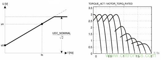當(dāng)電機(jī)在額定頻率以上調(diào)速時,逆變器的輸出頻率可以繼續(xù)升高,但是輸出端電壓只能維持在額定輸入值,此時定子磁通和調(diào)速頻率成反比下降,異步電機(jī)的工作狀態(tài)等同于直流電機(jī)的弱磁升速,電機(jī)的輸出扭矩隨磁通變化,輸出扭矩隨速度增加逐漸變小為恒功率工作模式。