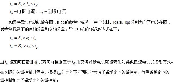 矢量控制是指根據(jù)電機(jī)運(yùn)行狀況同時控制輸出量的幅值和相位。其基本的工作原理是通過電機(jī)內(nèi)以同步轉(zhuǎn)速旋轉(zhuǎn)的參考d-q參考坐標(biāo)系的數(shù)學(xué)方法,解藕出控制電機(jī)勵磁方向的電流分量Id和控制電機(jī)的轉(zhuǎn)矩方向的分量Iq,從而可以將異步電機(jī)的控制方法等效為傳統(tǒng)直流電機(jī)的控制。