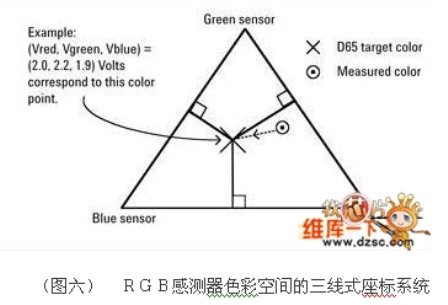 基本上來說,三色光感測器會產(chǎn)生一個(gè)三維色彩規(guī)格系統(tǒng),因此稱為RGB感測器色彩空間,這個(gè)系統(tǒng)可以讓特定色彩由感測器的輸出電壓來指定,例如具備特定亮度的D65白光可以記錄為:(Vred,?。郑纾颍澹澹睿。郑猓欤酰澹剑ǎ玻埃。玻?,?。保梗觯铮欤簦蟆?br />