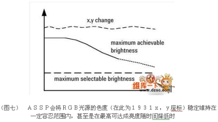 另一點(diǎn)相當(dāng)重要,同時(shí)必須注意的是,當(dāng)LED使用時(shí)間越久,光輸出強(qiáng)度就會降低,因此經(jīng)過一段時(shí)間后,RGB?。蹋牛南到y(tǒng)的最大可輸出亮度將會下降,雖然在大部分的應(yīng)用事實(shí)上都可以接受逐漸且穩(wěn)定的亮度衰減,但有時(shí)無法接受的是RGB發(fā)光系統(tǒng)色度的變化,ASSP擁有能夠穩(wěn)定控制RGB發(fā)光系統(tǒng)光度衰減的功能,例如維持色度的穩(wěn)定在一定的容忍度內(nèi),甚至當(dāng)最高可輸出亮度下降時(shí)。