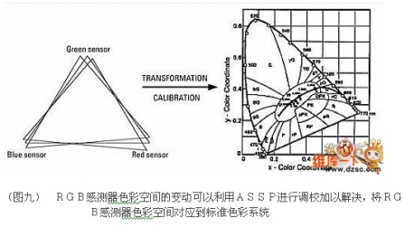 系統(tǒng)A中的三色光感測器在達(dá)成D65光輸出時(shí),會產(chǎn)生以上的電壓位準(zhǔn),但對系統(tǒng)B的光感測器,雖然達(dá)到和A系統(tǒng)一樣的D65光輸出,卻會產(chǎn)生不同的電壓位準(zhǔn)組合。換句話來說,由RGB感測器色彩空間所定義的色彩規(guī)格系統(tǒng)在每個(gè)系統(tǒng)都不一樣。