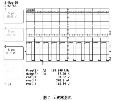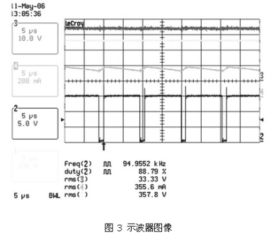 圖 2 、圖3 及表 2、表3 顯示了這種電路在90 ~265 VAC的通用輸入電壓范圍內(nèi),以350 mA驅(qū)動(dòng)兩個(gè)有6個(gè)串聯(lián)LUXEON FLOOD 25-0032 HB-LED板時(shí)的結(jié)果。表 2 顯示了在輸入電壓范圍內(nèi)良好的電流調(diào)節(jié)。圖 2 和圖3 說(shuō)明了正如理論所示的,由于占空比較小,輸入電壓較高時(shí)紋波較差。這表明在主電壓較低的地區(qū),如北美和日本,設(shè)備性能更加良好。然而,即使在最差的條件下,只要控制器輸入電壓保持在90 ~265 VAC的范圍內(nèi),仍可對(duì)電流進(jìn)行適時(shí)調(diào)節(jié)。同時(shí)對(duì)只使用6個(gè)HB-LED板的系統(tǒng)進(jìn)行了測(cè)量(見(jiàn)表 3) ,對(duì)比結(jié)果發(fā)現(xiàn),±1.3%的調(diào)節(jié)差距導(dǎo)致負(fù)載電壓的差距高達(dá)33.4V ~16.4V。