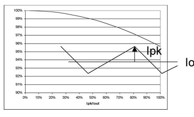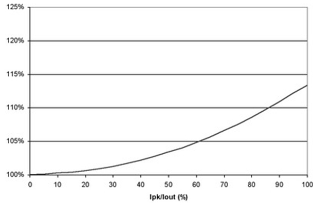 圖4 也闡明了即使在紋波電流較大的時(shí)候,對(duì)功耗也沒(méi)有重大影響。例如,50%的紋波電流僅增加不足5%的功率損耗。當(dāng)大大超過(guò)此水平時(shí),需要減小電源的DC電流以保持結(jié)溫不變,從而維持半導(dǎo)體的使用壽命。經(jīng)驗(yàn)法則顯示,結(jié)溫每降低10%,半導(dǎo)體使用壽命就會(huì)延長(zhǎng)兩倍。并且,許多設(shè)計(jì)都傾向于更小的紋波電流,這是因?yàn)殡姼衅鞯南拗啤=^大多數(shù)電感的設(shè)計(jì)處理能力小于20%的Ipk/Iout紋波電流比率。