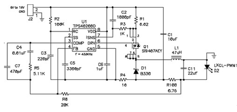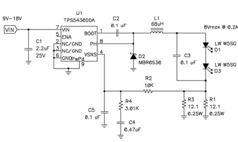 在輸出電壓始終小于輸入電壓的情況下,應(yīng)使用降壓穩(wěn)壓器,圖5顯示了該拓?fù)浣Y(jié)構(gòu)。在該電路中,對(duì)電源開(kāi)關(guān)的占空比 (duty factor) 進(jìn)行了控制,以在輸出濾波器電感 L1 上確立平均電壓。當(dāng)FET開(kāi)關(guān)閉合時(shí)(TPS5430 內(nèi)部),其將輸入電壓連接到電感器,并在L1中構(gòu)建電流。D2為環(huán)流二極管 (catch diode),可提供開(kāi)關(guān)斷開(kāi)時(shí)的電流路徑。電感器可對(duì)流過(guò)LED的電流起到平滑的作用,該工作可通過(guò)用電阻監(jiān)控(測(cè)量)LED電流,并將電壓與控制芯片內(nèi)部的參考電壓進(jìn)行比較,最終進(jìn)行調(diào)節(jié)。如果電流太低,則占空比增加,平均電壓也上升,從而也導(dǎo)致了電流的升高。該電路具有極佳的效率,因?yàn)殡娫撮_(kāi)關(guān)、環(huán)流二極管以及電流感測(cè)電阻上的壓降非常低。