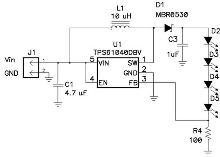 當(dāng)輸出電壓總是比輸入電壓大時(shí),最好采用升壓轉(zhuǎn)換電路,如圖6所示。該電路的U1有一個(gè)帶有控制電子器件的高度集成的電源開(kāi)關(guān)。當(dāng)開(kāi)關(guān)閉合時(shí),電流流過(guò)電感器到接地。當(dāng)開(kāi)關(guān)斷開(kāi)時(shí),U1的引腳 1 電壓會(huì)升高,直到D1導(dǎo)通。然后電感器放電,電流進(jìn)入輸出電容器(C3)和LED串。在絕大多數(shù)應(yīng)用中,C3通常用于平滑LED電流。如果沒(méi)有C3,則 LED電流將是斷斷續(xù)續(xù)的。也就是說(shuō),它會(huì)在零和電感電流之間切換,這會(huì)導(dǎo)致 LED 熱量增加(從而縮短使用壽命),亮度減少。在前面的例子中,LED 的電流是通過(guò)一個(gè)電阻感測(cè)的,并且占空比會(huì)發(fā)生相應(yīng)的變化。請(qǐng)注意,本拓?fù)浯嬖谝粋€(gè)嚴(yán)重的問(wèn)題,即它沒(méi)有短路保護(hù)電路。若輸出短路,則會(huì)有較大的電流通過(guò)電感器和二極管,從而導(dǎo)致電路失效,或者輸入電壓崩潰。