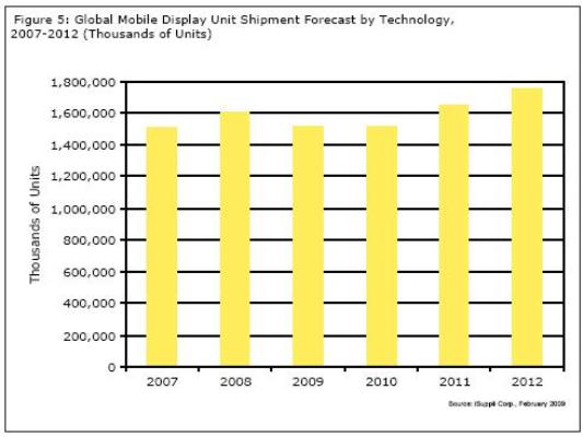 圖5所示為iSuppli公司對于2007-2012年手機顯示器市場的預(yù)測。