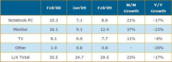 DisplaySearch上海辦公室,2009年3月23日 --- 根據DisplaySearchy最新關于全球TFT LCD出貨調查指出,二月份大尺寸面板出貨量為2千950萬片,較上月大幅成長23%,營收直逼29.5億美元,較上月成長14%,這是自2008年九月份以來首次見到成長的月份。二月份的良好表現(xiàn)主要來自于急單效應與客戶持續(xù)補充庫存,也是TFT LCD產業(yè)即將觸底反彈的信號。