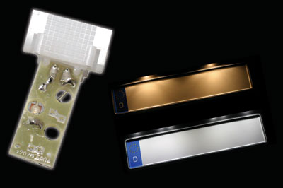 如圖2所示,光線可以從安裝在小尺寸PCB板上的表面貼裝LED器件發(fā)出,并使用限流電阻和反極性保護二極管。光線被直接照到簡單或精心設(shè)計的導光管上,這是約束光線的極其簡單方法。比較常用的方法是用適當?shù)?ldquo;透鏡”或投光面體,安裝方法也經(jīng)常是在轎車內(nèi)部把它夾進車門嵌板開口的地方、中央控制臺或儀表盤上。